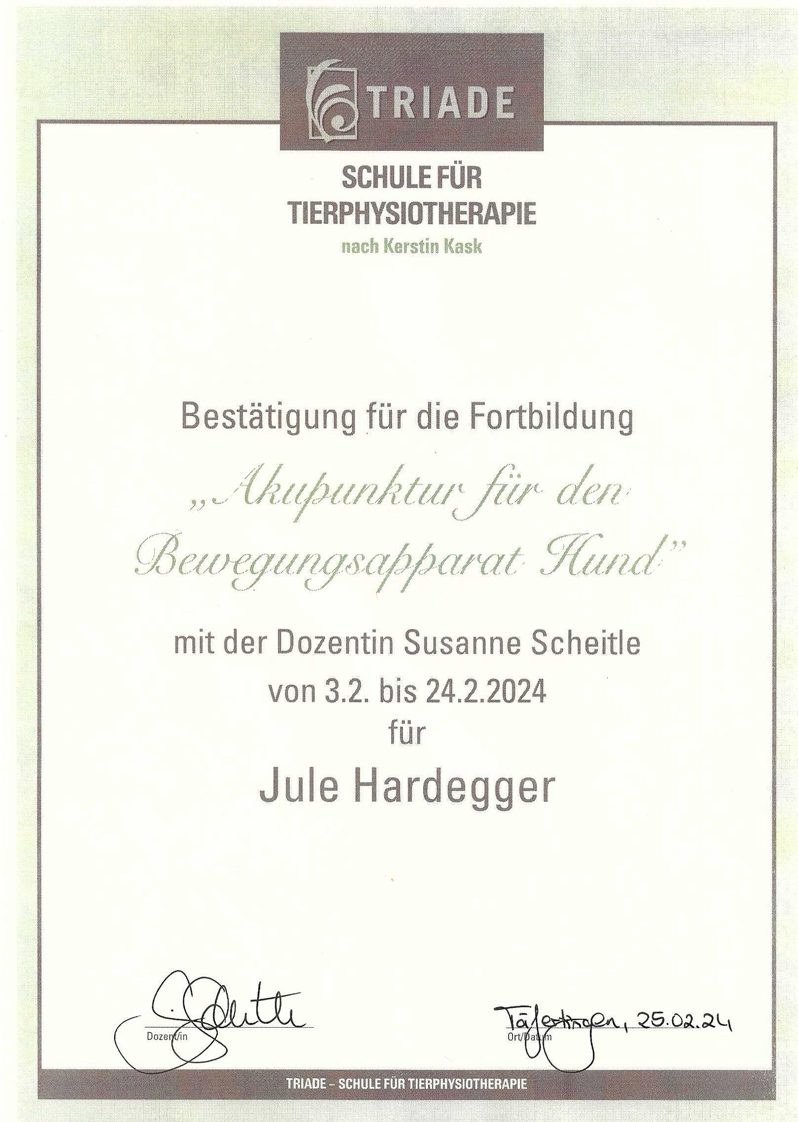 Die Tierphysiotherapie ersetzt nicht den Tierarztbesuch. Eine Diagnose kann ausschließlich durch den Tierarzt gestellt werden.